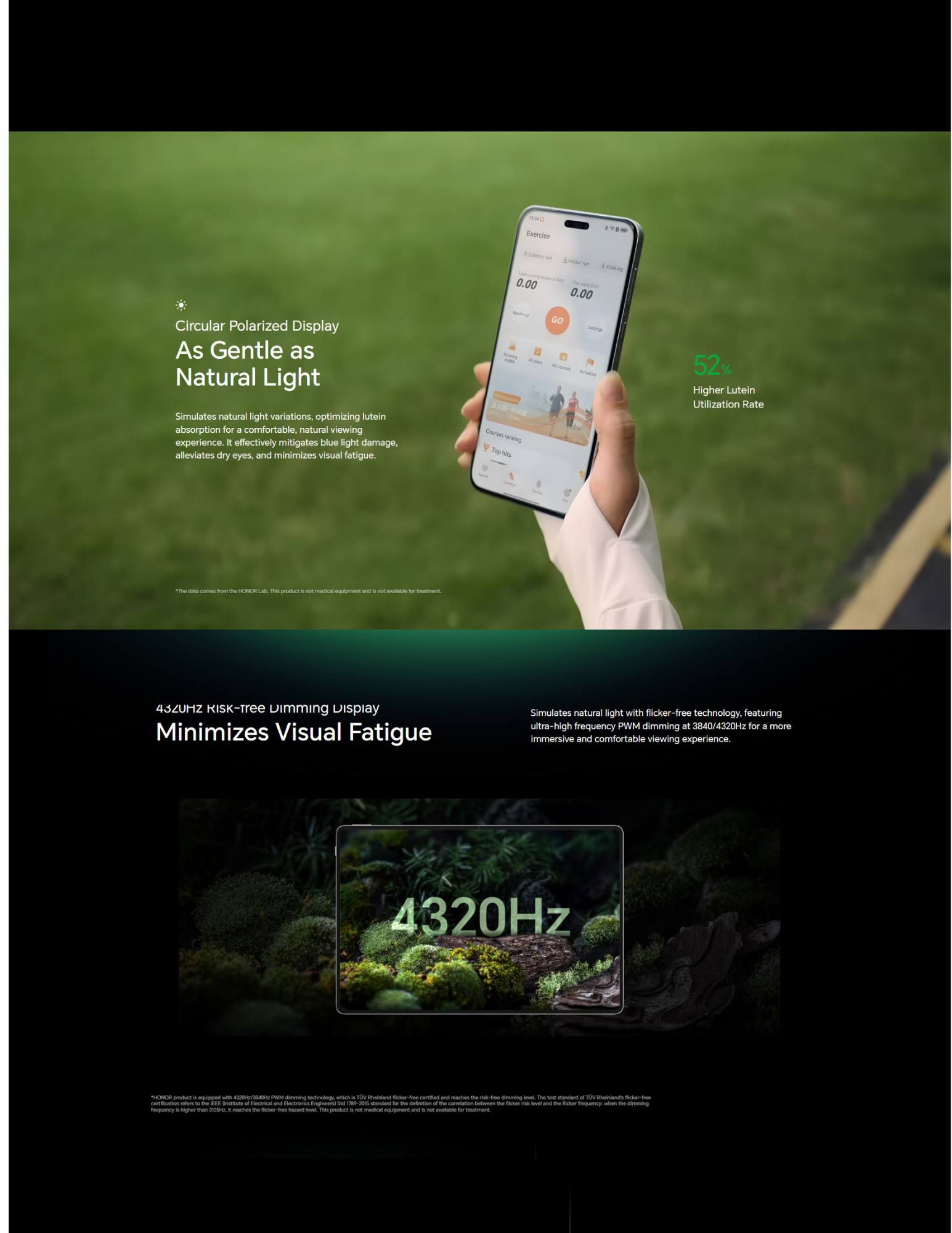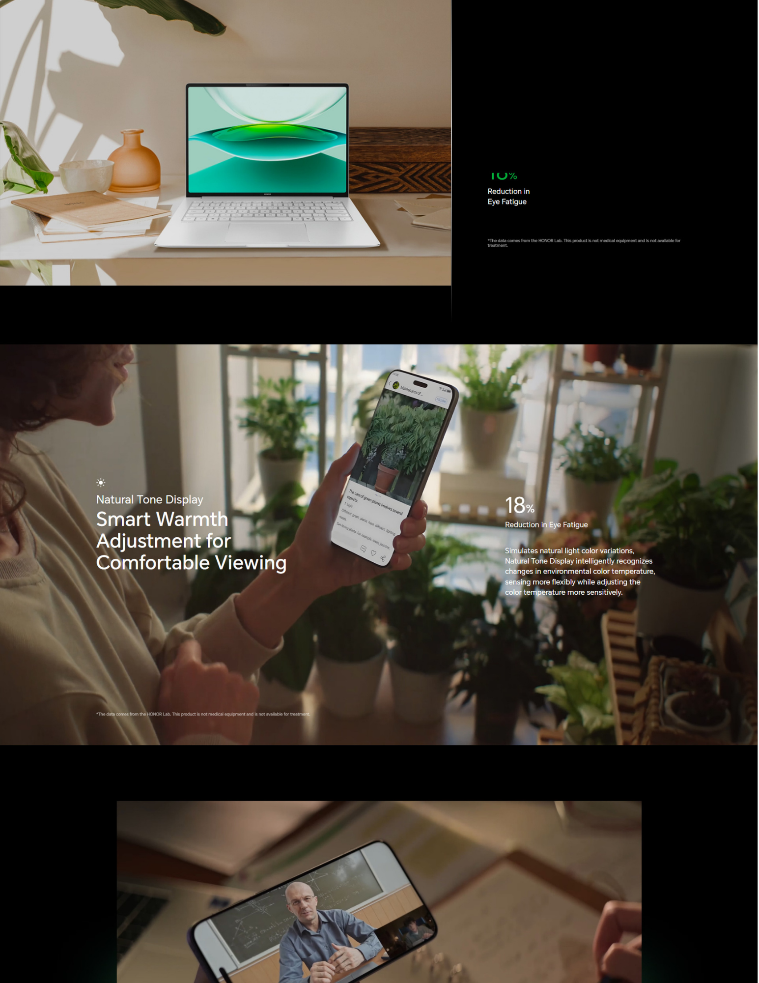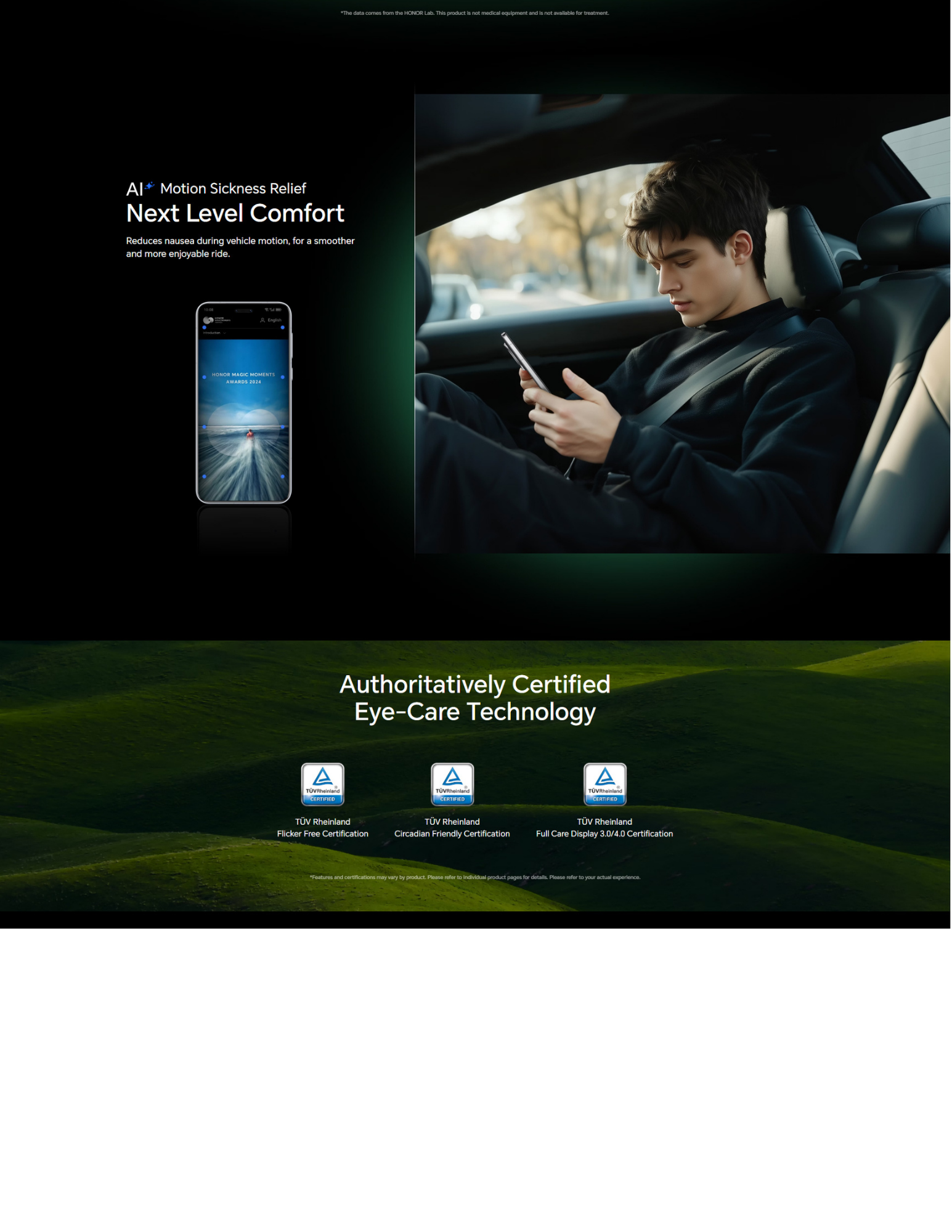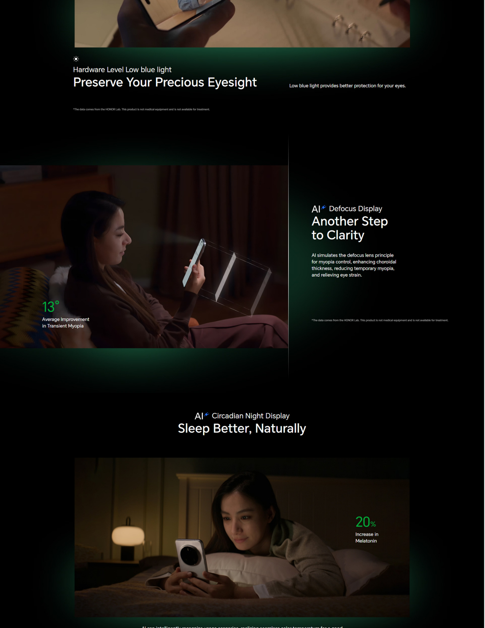 HONOR AI Eye Comfort Display Multi-Dimensional Eye Care, All-Day Protection HONOR lead in eye-protecting display technology. Multi-dimensionally simulating natural light to constantly advance screen comfort. AI-enabled screens intelligently adjust brightness to provide eye care. Multi-dimensional technology works together to protect your vision.