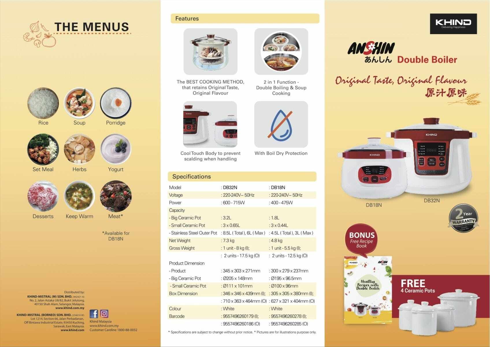 Model:DB32NVoltage:220-240V~50HzPower:600-715WCapacity:Big Ceramic Pot:3.2LSmall Ceramic Pot: 3x 0.65LStainless Steel Outer Pot:8.5L(Total), 6L(Max)Net Weight:7.3kgGross Weight:8kgProduct Dimension:345 x 303 x 271mmBig Ceramic Pot Dimension:ø205 x 148mmSmall Ceramic Pot Dimension:ø111 x 101mmBox Dimension:346 x 346 x 439mm