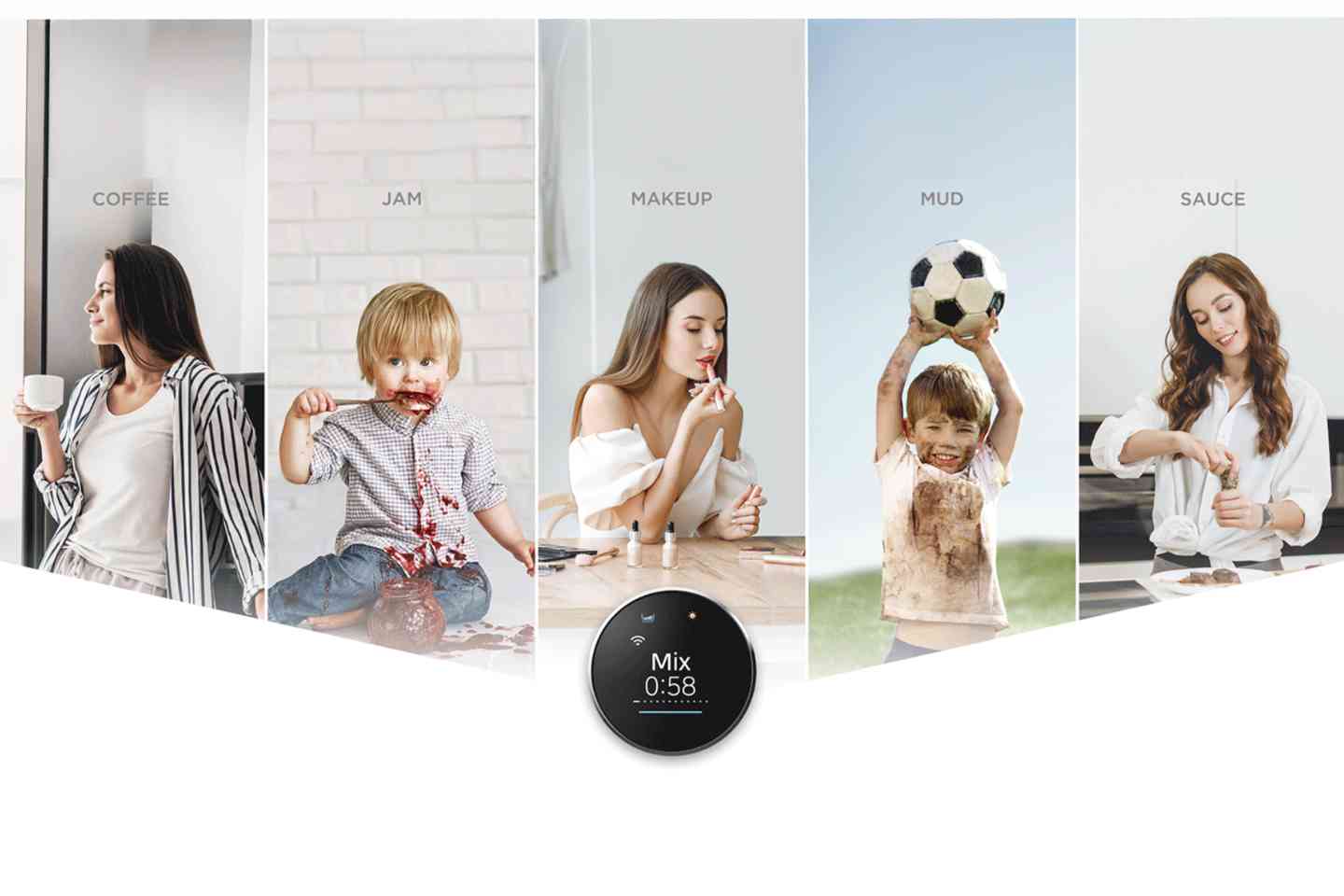 The “Stain” function* adjusts washing temperature and duration to tackle the toughest of stains: Coffee, jam, makeup, mud, and sauce. It breaks down these stains with the ideal water temperature and scrub wash effect, saving time on pre-care and handwashing, no matter the type of stain.