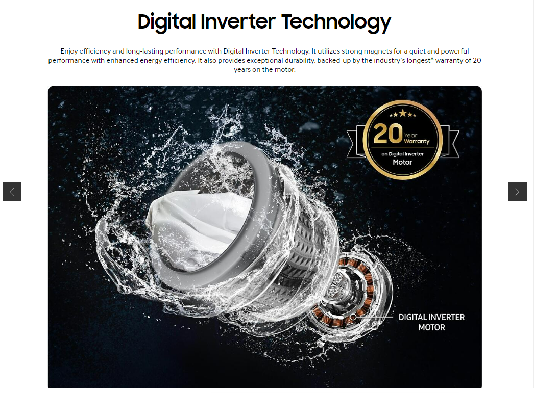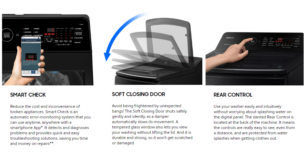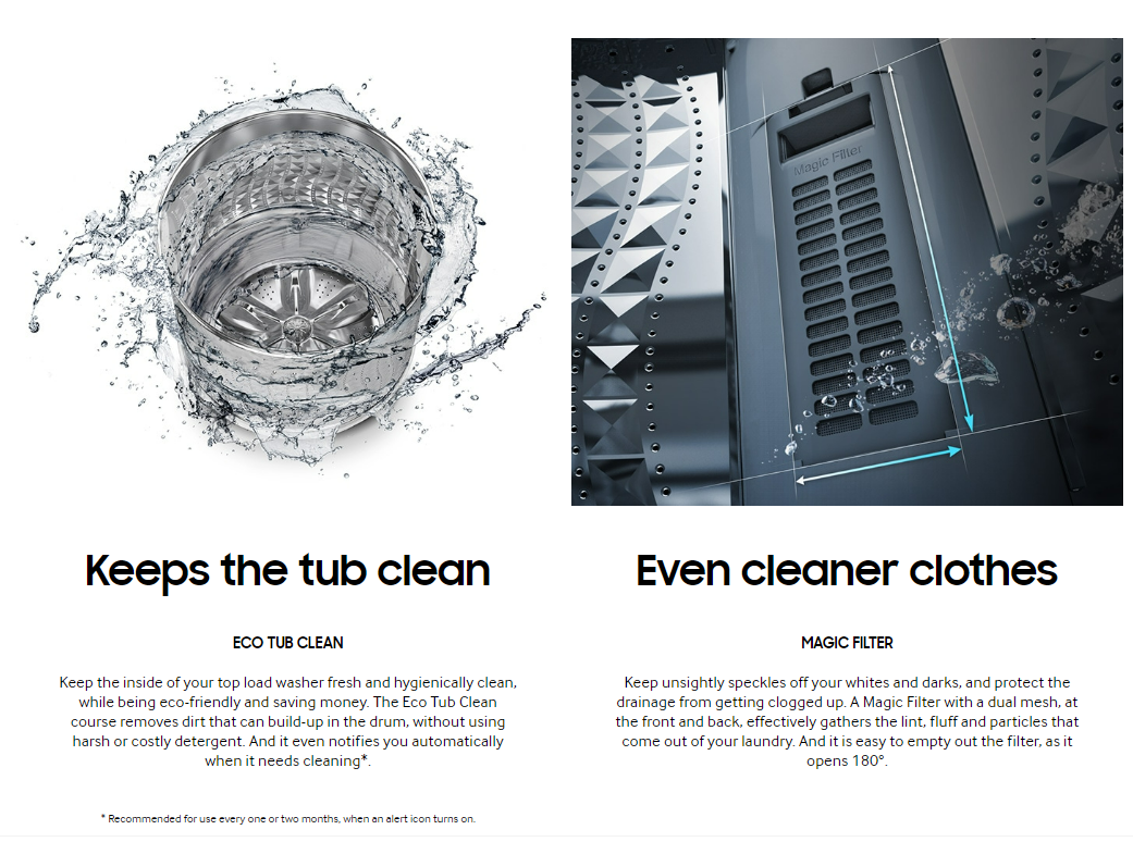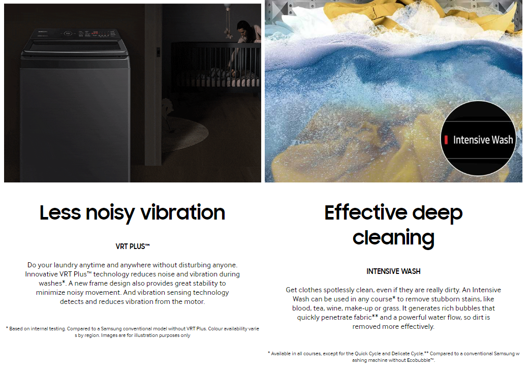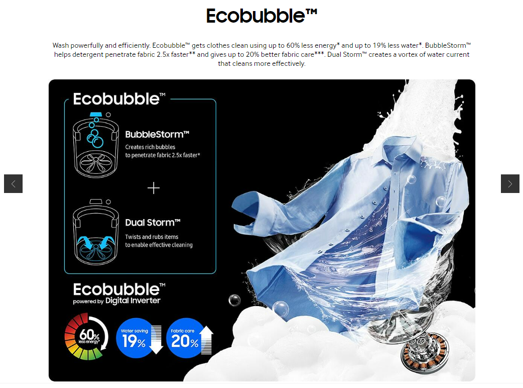 * Based on internal testing of the WA4000B 7kg model with Ecobubble™ and Digital Inverter motor, using an IEC 2kg load (water level 4), compared to the WA4000HS 7kg model without Ecobubble™ and an AC motor (water level 2). Results may vary depending on the actual usage conditions.** Based on internal testing, using Artificially Soiled Fabric (EMPA 120), compared to a Samsung conventional washing machine, WA4000B 7kg model. Results may vary depending on the actual usage conditions.*** Based on severity of washing action index, compared to a Samsung conventional washing machine, WA4000B 7kg model. Results may vary depending on the actual usage conditions.