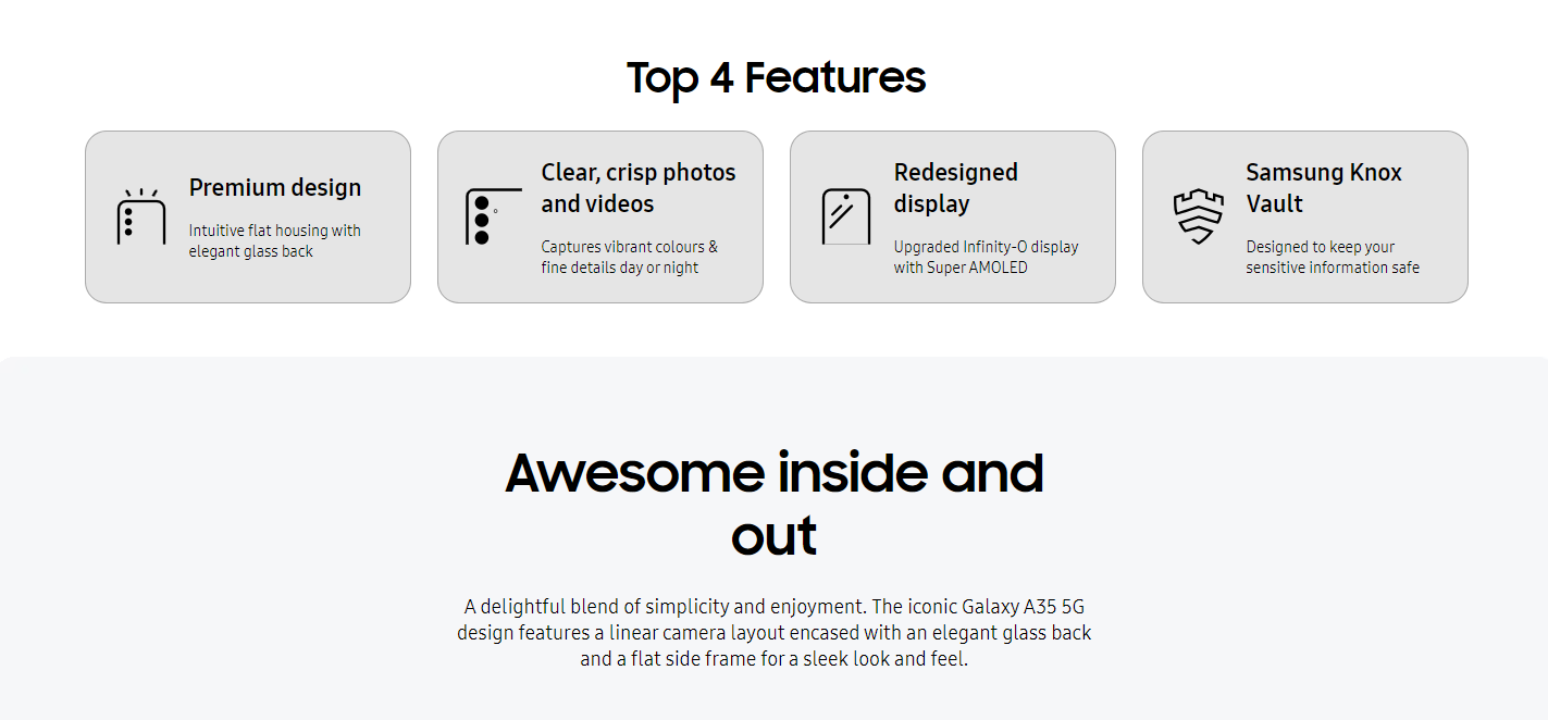 *Color availability may vary by country, region or carrier.**Galaxy A35 5G is rated as IPX4/IP67 under IEC standard 60529. Based on lab test conditions, the device is sprayed by 10 liters of fresh water per minute for 5 minutes at all angles (IPx4) and submersion in up to 1 meter of fresh water for up to 30 minutes (IP67). Not advised for beach or pool use. Water and dust resistance of device is not permanent and may diminish over time.
