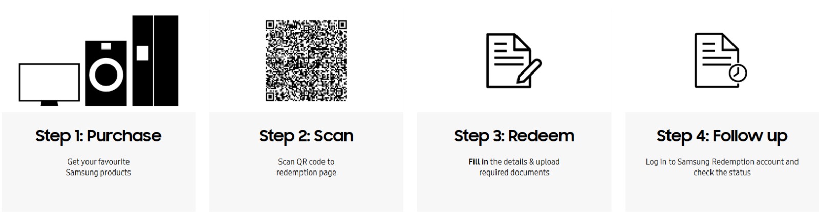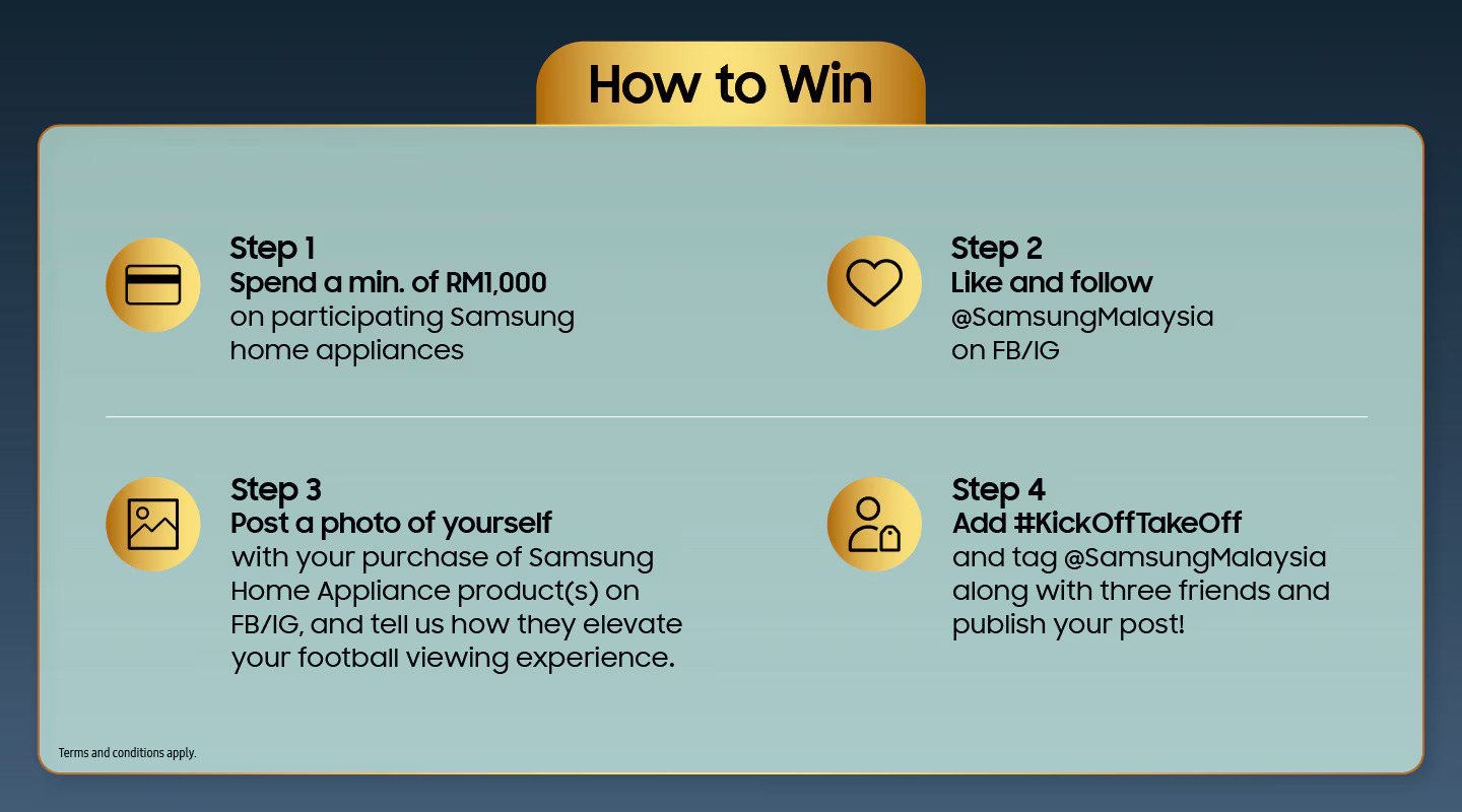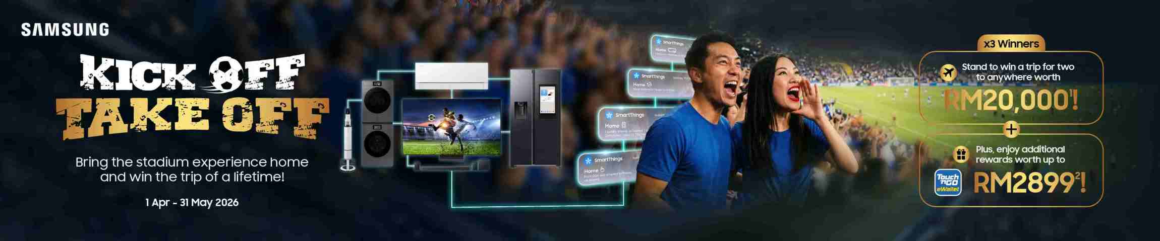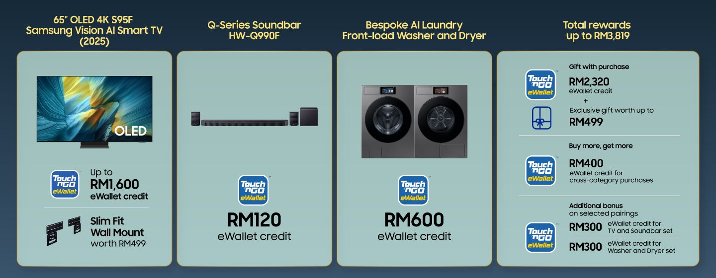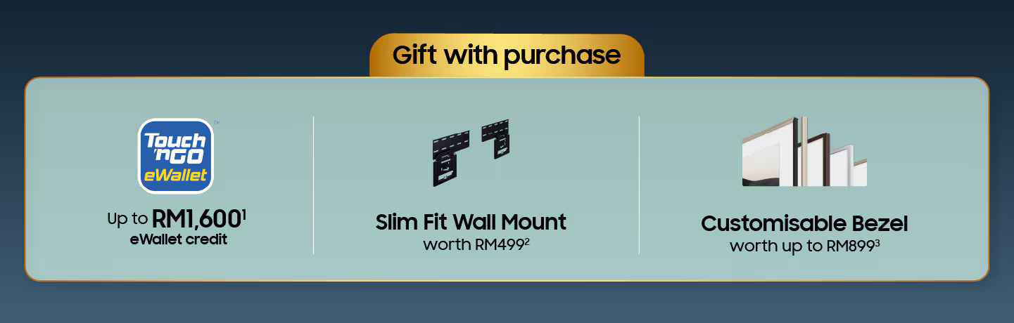 ¹For selected Samsung TVs, sound devices and home appliances only. ²Only applicable for selected TV purchases. ³Gift exclusive to The Frame TV purchases. Promotion is valid while stocks last from 1 April - 31 May 2026. Redemption of free Touch 'n Go eWallet credit and gifts valid from 1 April - 15 June 2026 and may vary depending on purchase platforms. Promotion is valid while stocks last and on a first-come, first-served basis. Images are for illustration purposes only.